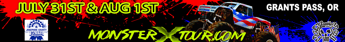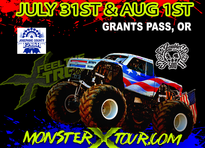 GRANTS PASS, OR will be motorsport entertainment’s epicenter with the nation’s most competitive MONSTER TRUCKS as the MONSTER X TOUR invades the JOSEPHINE COUNTY FAIR on July 31st and August 1st for TWO Monster shows! See these incredible 10,000-pound, car crushing giants compete in racing, wheelie contests, and then rock the house with amazing freestyle action during the Monster X Tour! Plus, you can see the trucks up close at the pre-event Autograph Pit Party!