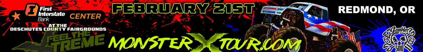 REDMOND, OR will be motorsport entertainment’s epicenter with the nation’s most competitive MONSTER TRUCKS as they invade the FIRST INTERSTATE BANK CENTER at the Deschutes County Fairgrounds on February 21st. Come witness these incredible 10,000-pound, ground pounding giants compete in racing, wheelie contests, and then rock the house with amazing freestyle action during the Monster X Tour! Plus, you can see the trucks up close at the pre-event Pit Party! We’re going to BRING THE ACTION!